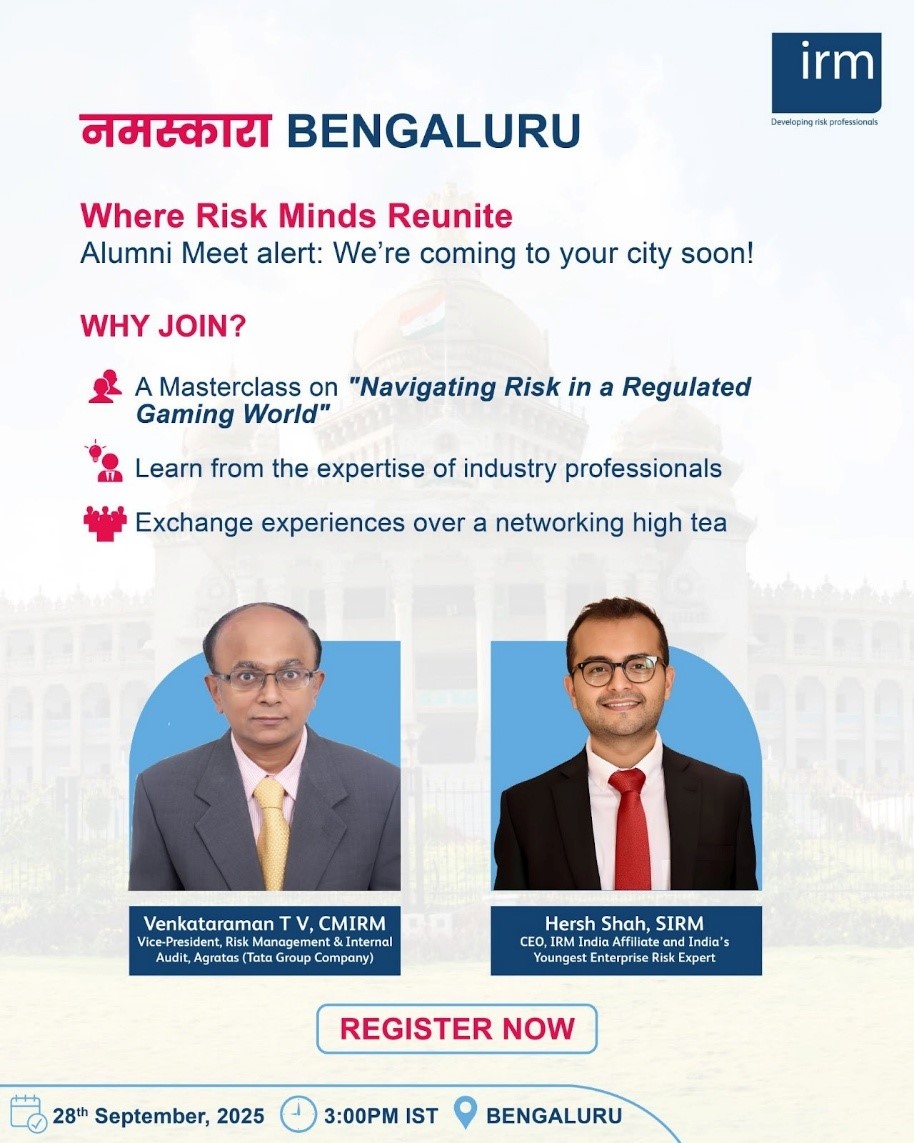 To Register for the Bengaluru Alumni Meet, log in to the Enterprise Risk Knowledge Centre, click on Important Announcements, and register under Upcoming Alumni Meet. Once your membership is verified, you will receive a confirmation email with venue and other details. Limited seats only.