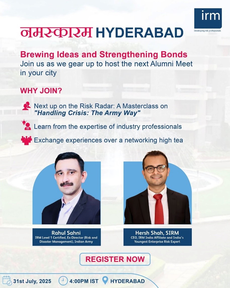 We extend a warm invitation to all IRM certified members in Hyderabad to discover powerful crisis management strategies inspired by military precision and discipline, and learn how to apply them to real-world business risks and uncertainties with an exclusive Masterclass on “Handling Crisis: The Army Way” over high-tea. Earn a certificate of participation with CPD hours at the end of the session. Get ready to connect, learn, and share experiences with Mr. Rahul Sahni, IRM Level 1 Certified, Former Director (Risk & Disaster Management), Indian Army, Mr. Hersh Shah, CEO, IRM India Affiliate and India’s Youngest Enterprise Risk Expert .