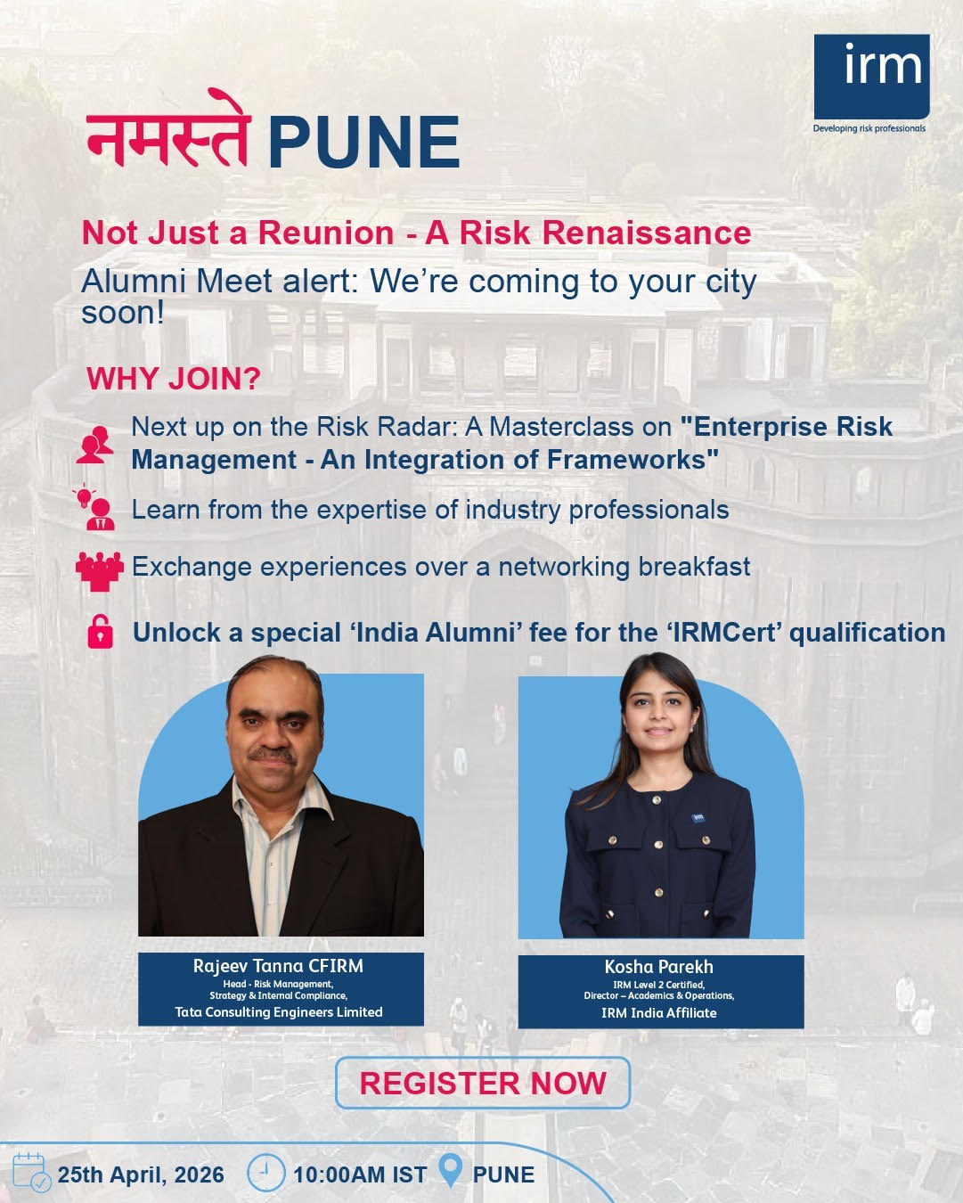 Connect, exchange insights, and celebrate the spirit of risk excellence on Saturday, 25th April 2026 at 10:00 AM IST. Earn a Certificate of Participation with CPD Hours and unlock a special ‘India Alumni’ fee for the IRMCert qualification.
