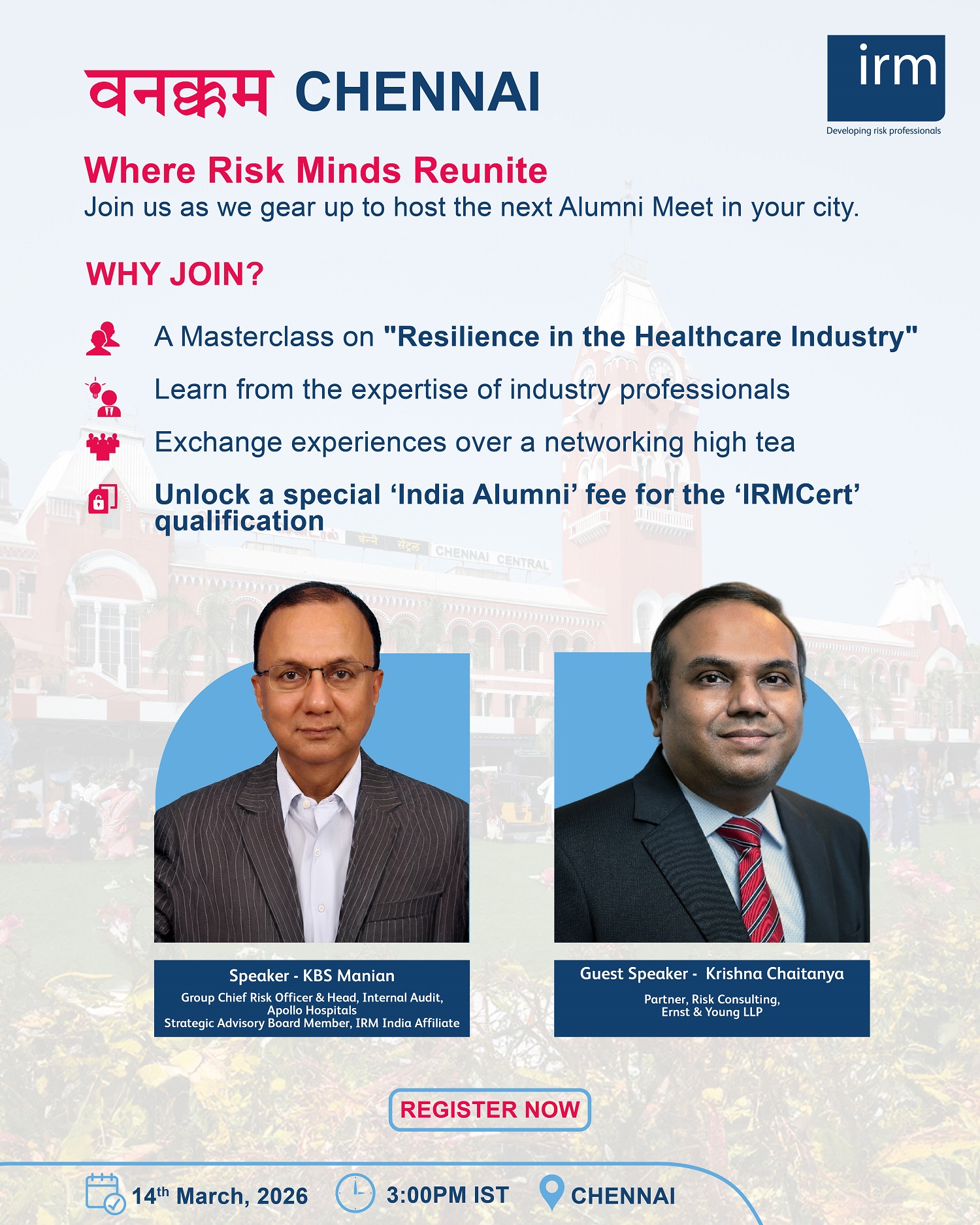 Join us for an engaging networking high tea and exclusive Masterclass on “Resilience in the healthcare industry” with Mr. KBS Manian (Speaker) - Group Chief Risk Officer & Head, Internal Audit, Apollo Hospitals and Mr. Krishna Chaitanya (Guest Speaker) - Partner, Risk Consulting, Ernst & Young LLP. Connect, exchange insights, and celebrate the spirit of risk excellence on Saturday, 14th March 2026 at 3:00 PM IST. Earn a Certificate of Participation with CPD Hours and unlock a special ‘India Alumni’ fee for the IRMCert qualification.