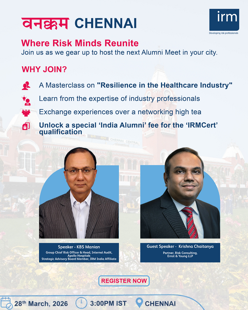 Join us for an engaging networking high tea and exclusive Masterclass on “Resilience in the healthcare industry” with Mr. KBS Manian (Speaker) - Group Chief Risk Officer & Head, Internal Audit, Apollo Hospitals and Mr. Krishna Chaitanya (Guest Speaker) - Partner, Risk Consulting, Ernst & Young LLP. Connect, exchange insights, and celebrate the spirit of risk excellence on Saturday, 28th March 2026 at 3:00 PM IST. Earn a Certificate of Participation with CPD Hours and unlock a special ‘India Alumni’ fee for the IRMCert qualification.