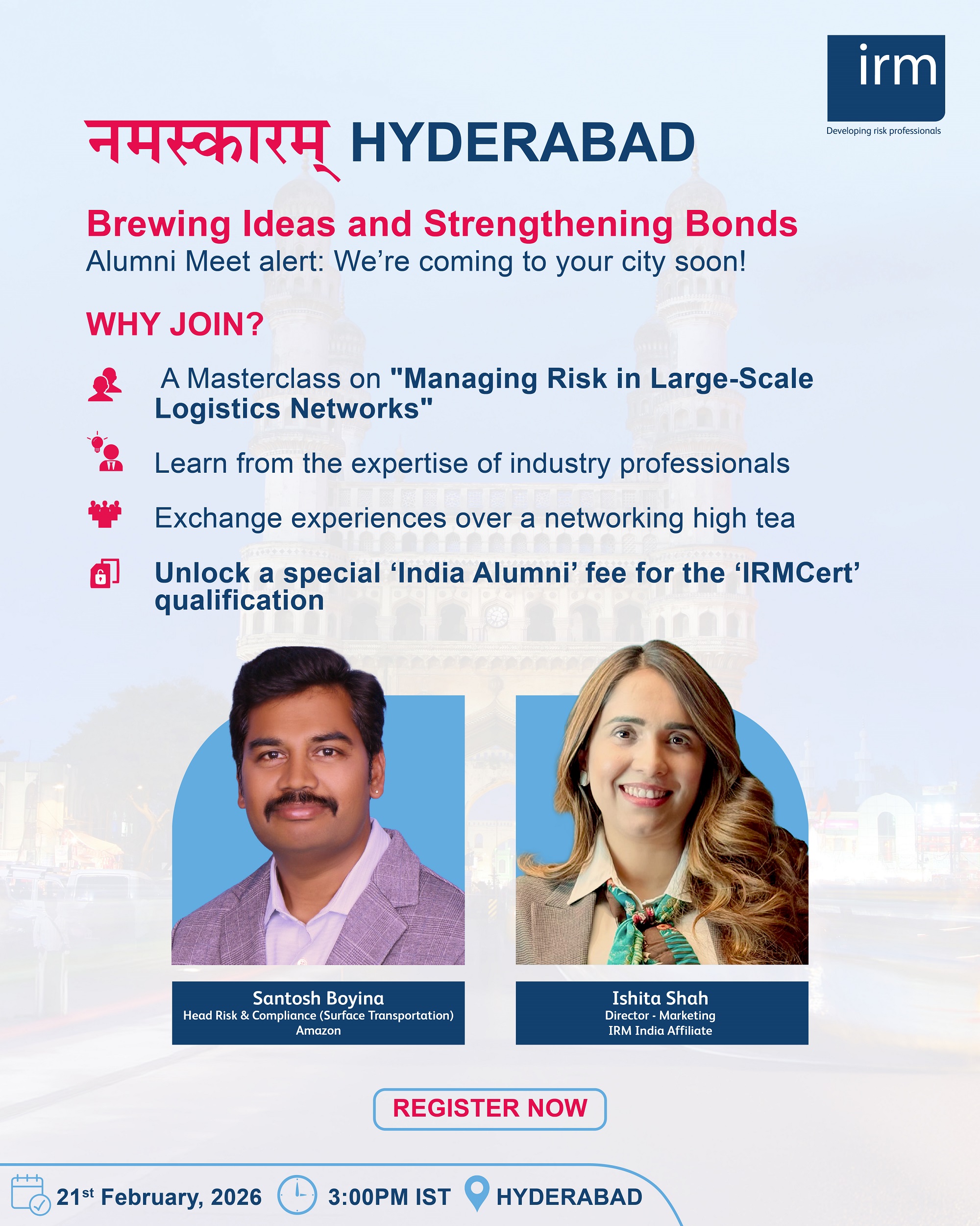 Join us for an exclusive Masterclass on “Managing Risk in Large-Scale Logistics Networks” over high-tea on Saturday, 21st February 2026 at 3:00 PM IST. Earn a participation certificate with CPD hours and unlock a special India Alumni fee for IRMCert. Connect and learn with Mr. Santosh Boyina Head – Risk & Compliance (Surface Transportation), Amazon and Ms. Ishita Thakkar Shah Director – Marketing, IRM India Affiliate