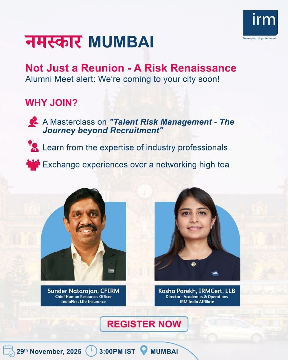 Sunder NatarajanChief Risk OfficerIndiaFirst Life InsuranceDeputy Chair - IRM India West Regionspkr-3103695572CEO_-_IRM_India_Affiliate_(3).pngStep into the dynamic world of Talent Risk Management, where people, purpose, and performance intersect to shape resilient organizations. Join us for an exclusive Masterclass on “Talent Risk Management – The Journey Beyond Recruitment”, exploring how leaders can anticipate, assess, and mitigate people-related risks in a rapidly evolving workforce landscape over high-tea on Saturday, 29th November, 2025 at 3:00PM IST. Earn a Certificate of Participation with CPD hours. Connect, learn, and exchange insights with: